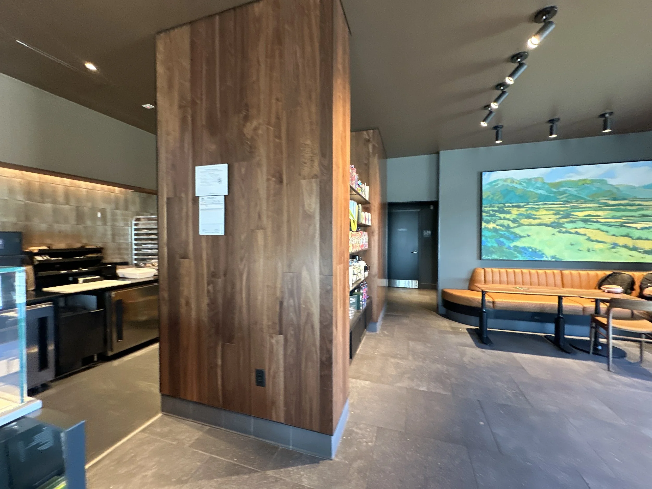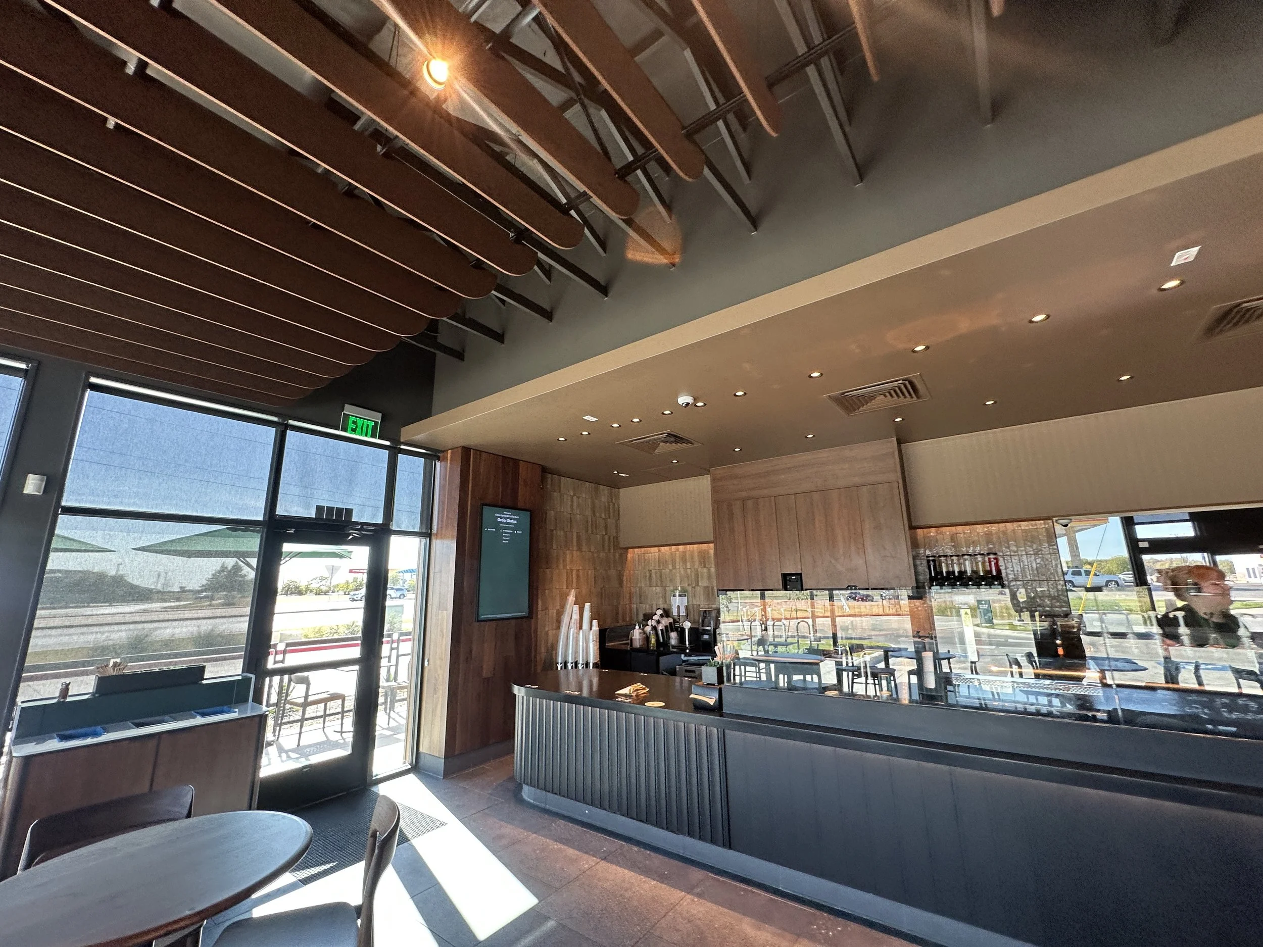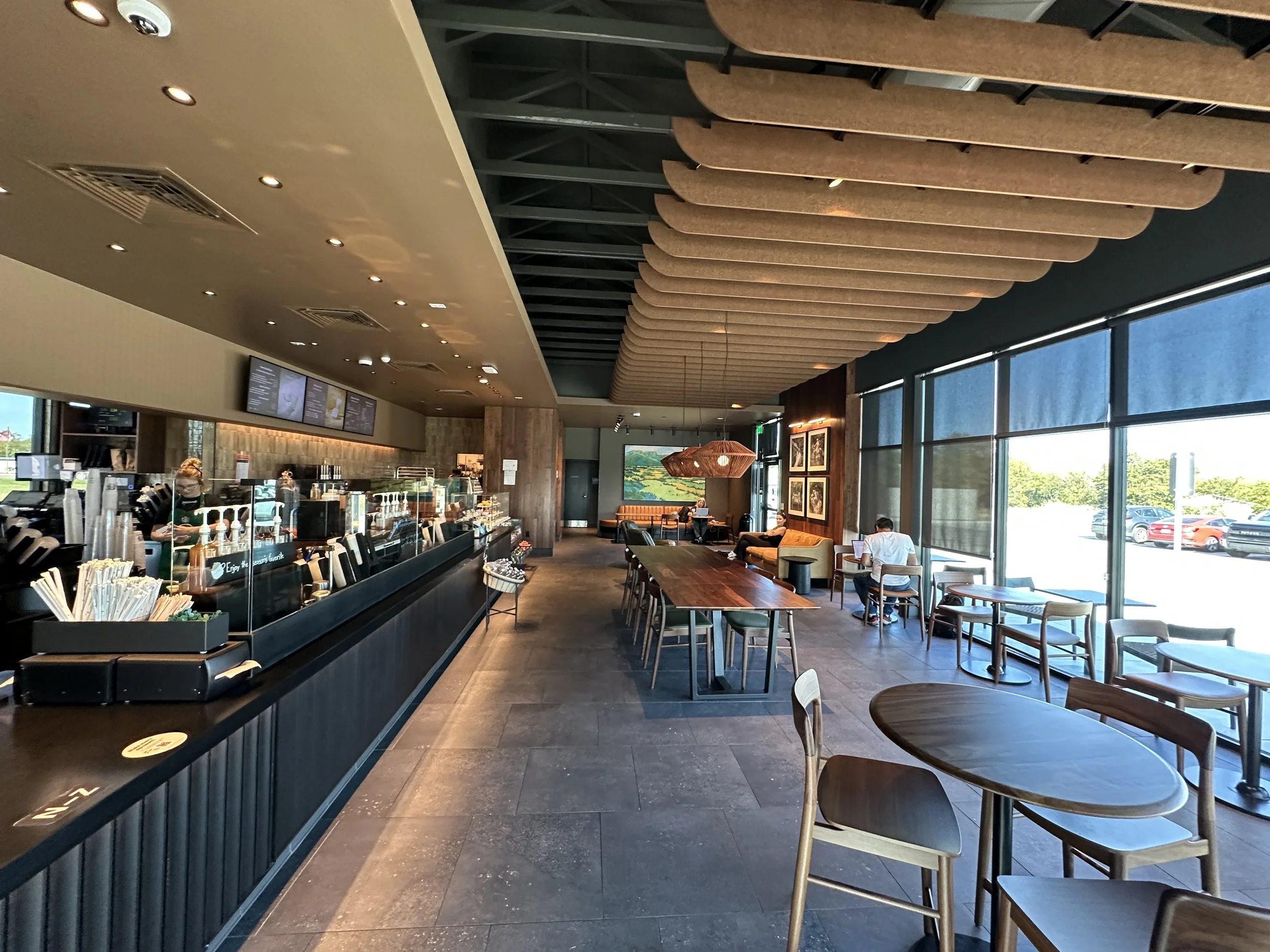 Building materials, site elements, and minor modifications were coordinated to ensure our design team provided a space for Starbucks' operational needs and unique, but signature customer experience. The interior design incorporates a blend of modern elements with warm tones, creating an inviting atmosphere for guests.